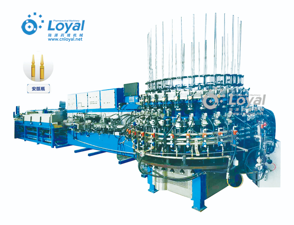 立式安瓿瓶生产线能够满足安瓿瓶的自动生产需要,包括自动上管机、安瓿瓶成型机、安瓿瓶在线检测系统、打点机构、刻痕机构、印字机构、退火炉、后端检测机构、理瓶线、装箱设备。该生产线自动化程度高,结构紧凑,产量高,布局合理,能耗少,可生产1ml,2ml,3ml,5ml,10ml,20ml不同直径的安瓿瓶。